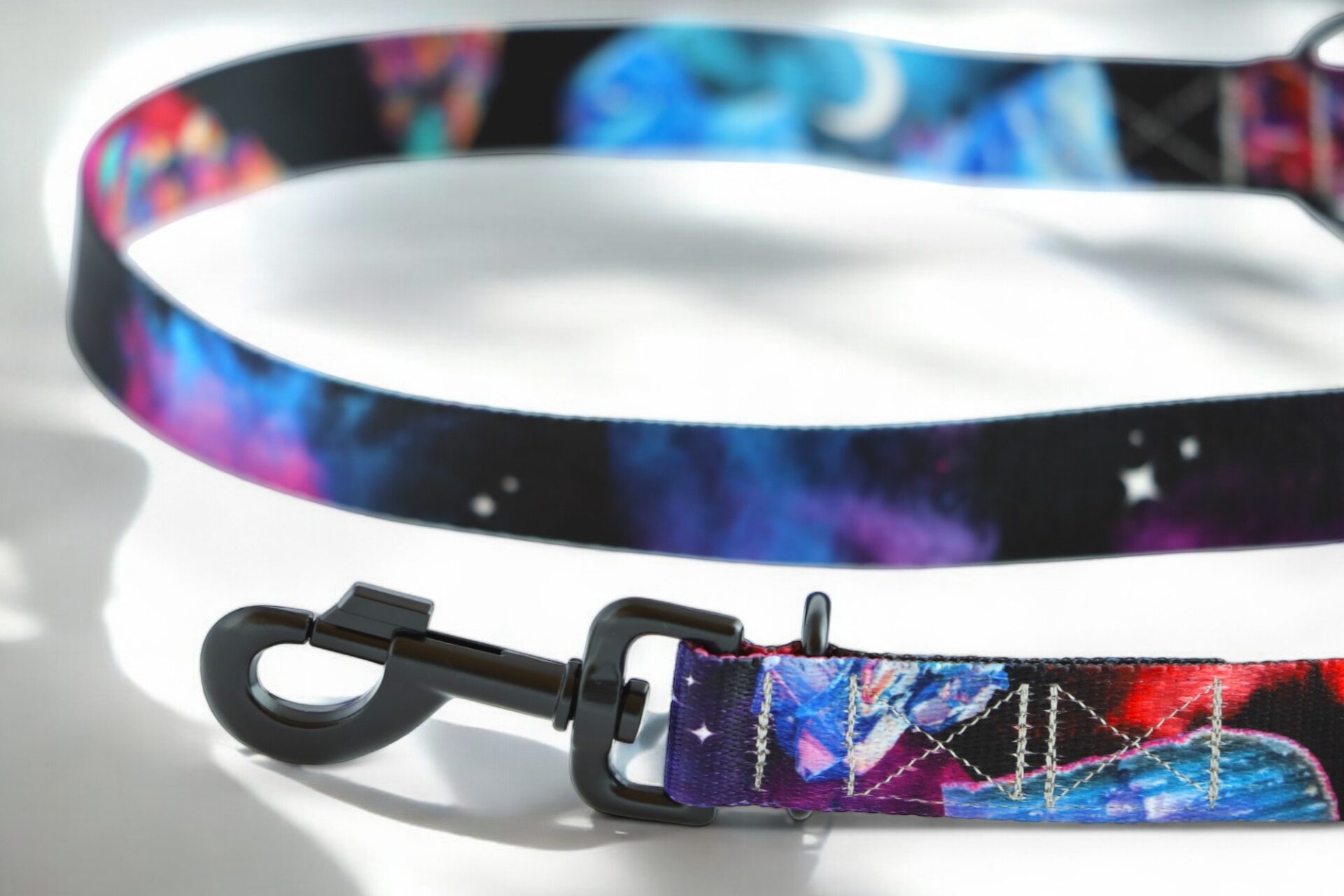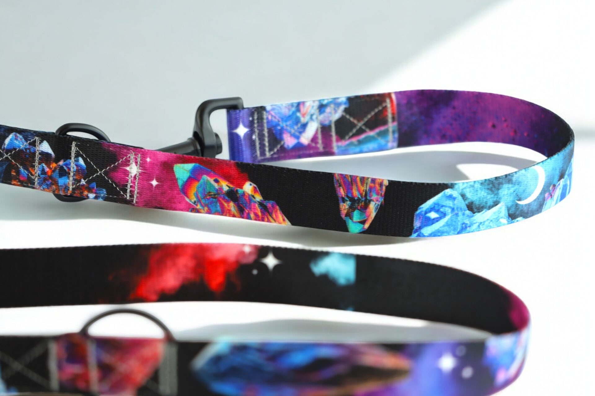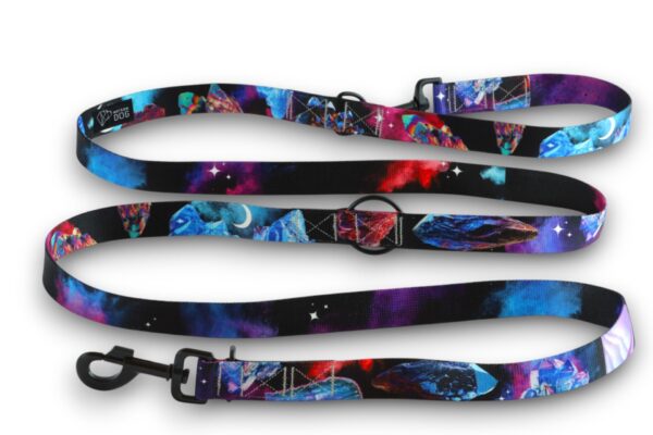 Smycz posiada stopniowalną długość dzięki trzem przepięciom. Karabińczyki znajdują się po obu stronach smyczy, w charakterze przepięć wszywamy dwa półkola i jedno kółko na środku.