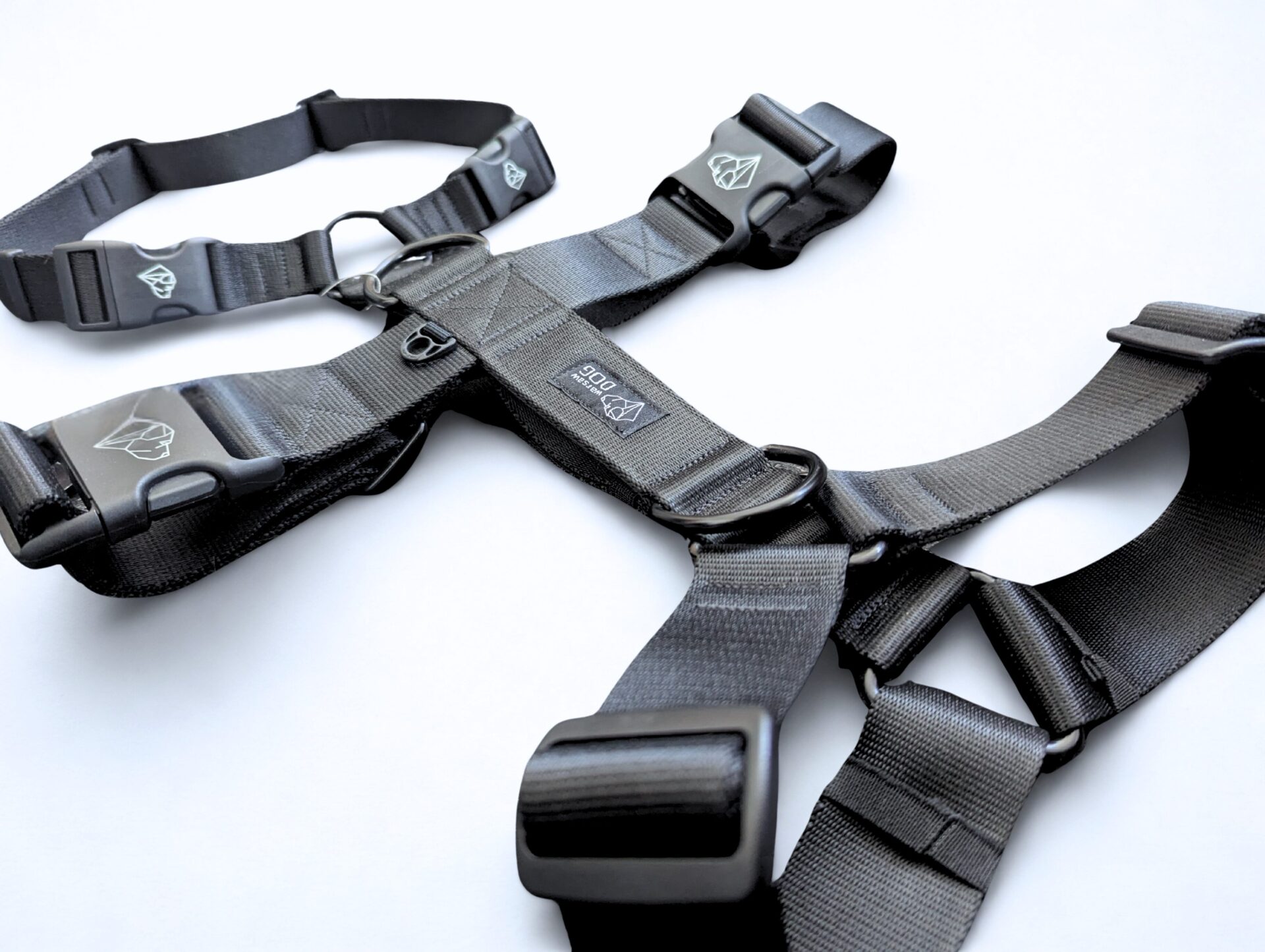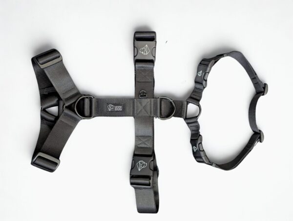 Trzy obręcze połączone paskami uniemożliwiają psu wyswobodzenie się. Szelki idealne dla uciekiniera o wrodzonych talentach psa-gumy.